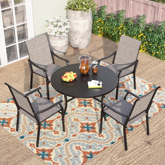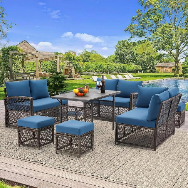 Crafted from premium all-weather PE rattan wicker and a durable galvanized steel frame, this sectional set is built to withstand the elements and provide long-lasting enjoyment. The set includes two loveseats with extendable side tables, one corner sofa, one long bench, and a spacious dining table, comfortably seating up to seven people. Whether you’re looking to create a cozy corner for intimate gatherings or a larger area for entertaining, this versatile set has you covered.